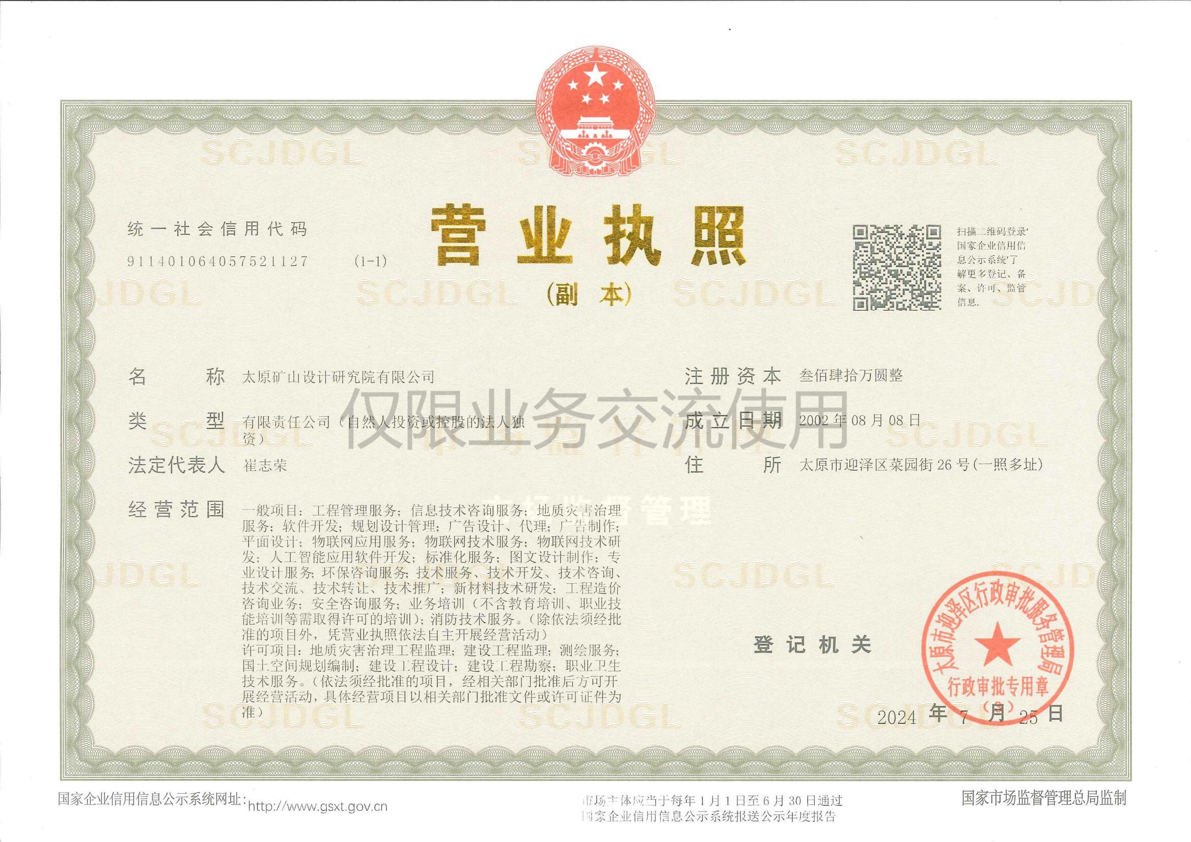 公司主要從事礦山采選尾工程設計、智能化及自動化礦山、建設綠色礦山、工程技術咨詢、規(guī)劃設計管理、施工勞務分包、土地規(guī)劃、地質(zhì)災害治理服務、安全生產(chǎn)技術服務、軟件開發(fā)及測繪服務;煤礦、非煤礦山設計;煤礦、非煤礦山、危險化學品安全評價(業(yè)務范圍:煤炭開采業(yè);金屬、非金屬及其他礦采選業(yè);石油加工業(yè),化學原料、化學品及醫(yī)藥制造業(yè));非煤礦山、冶金等工商貿(mào)企業(yè)、危險化學品從業(yè)單位安全生產(chǎn)標準化評審;公共場所衛(wèi)生、生活飲用水、公共場所集中中央空調(diào)通風系統(tǒng)的檢驗、檢測、評價;職業(yè)健康檢測檢驗;建設項目職業(yè)病危害評價、職業(yè)危害因素檢測與評價;安責險技術服務;業(yè)務培訓等工作。