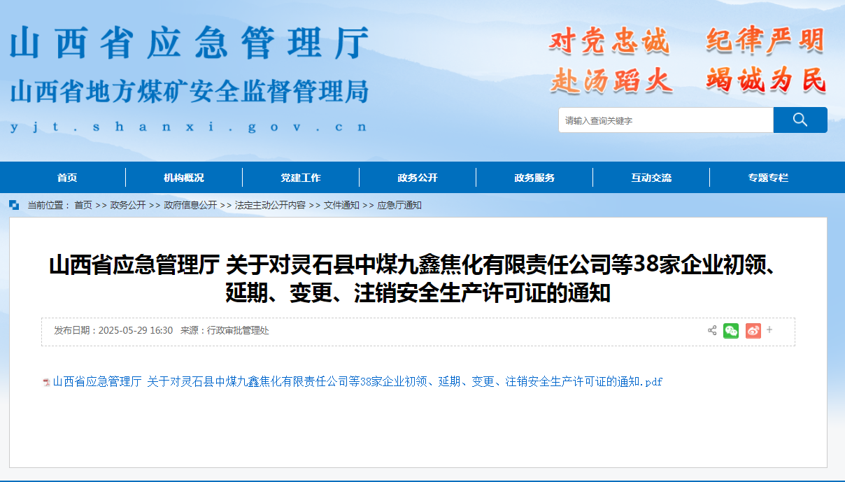 山西省應急管理廳 關于對靈石縣中煤九鑫焦化有限責任公司等38家企業(yè)初領、延期、變更、注銷安全生產(chǎn)許可證的通知